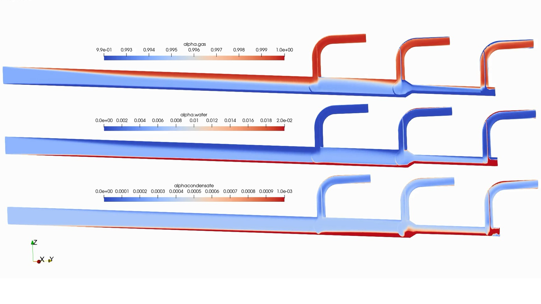 HCS developed a conceptual CFD model of the system using multiphase flow simulation tools to analyze the phase distribution mechanisms. The uneven phase distribution was traced back to flow stratification within the manifold: gas tended to concentrate in the upper section, while the heavier liquid phases accumulated near the bottom and were carried mostly to the last outlet. This condition required corrective measures to ensure a more balanced allocation of phases among the separators, reducing risks of operational inefficiencies and equipment stress. Several remediation alternatives were evaluated, with alternatives showing varying degrees of effectiveness. These results provided key technical input for decision-making regarding future system modifications.